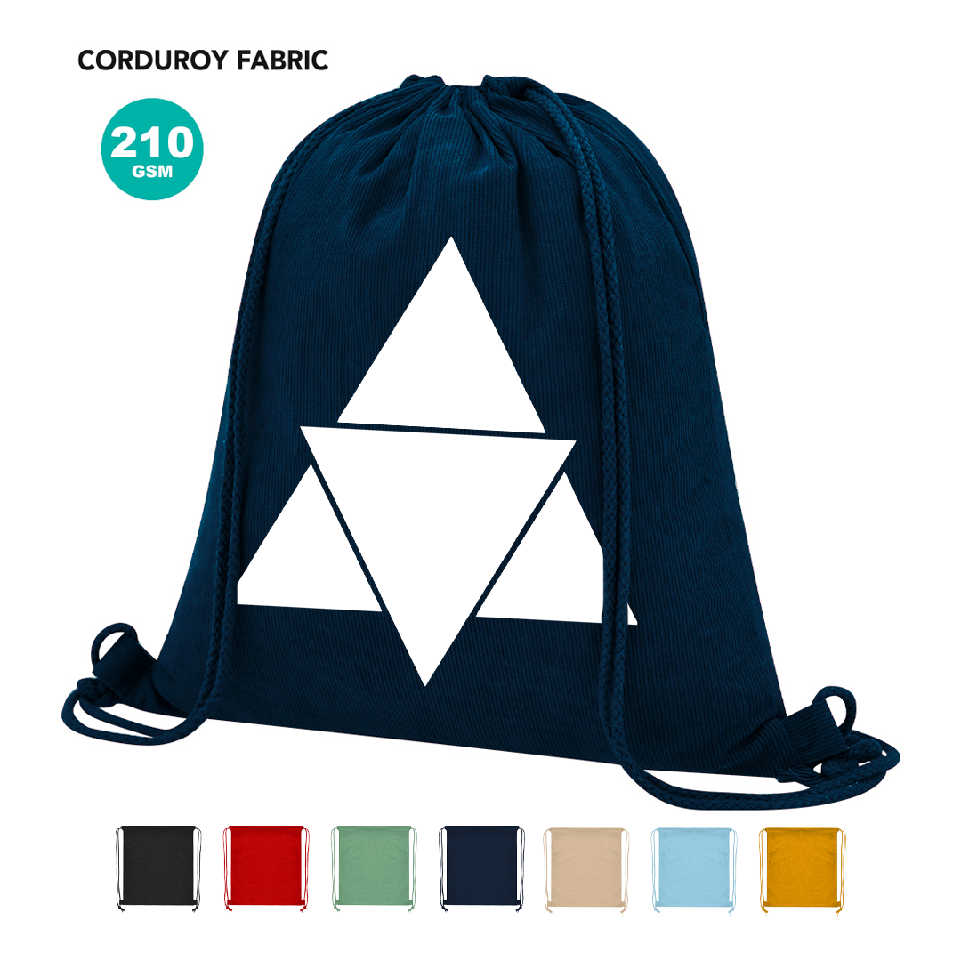 • Mochila de cuerdas fabricada en resistente pana de poliéster.