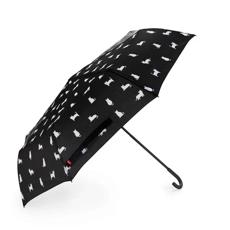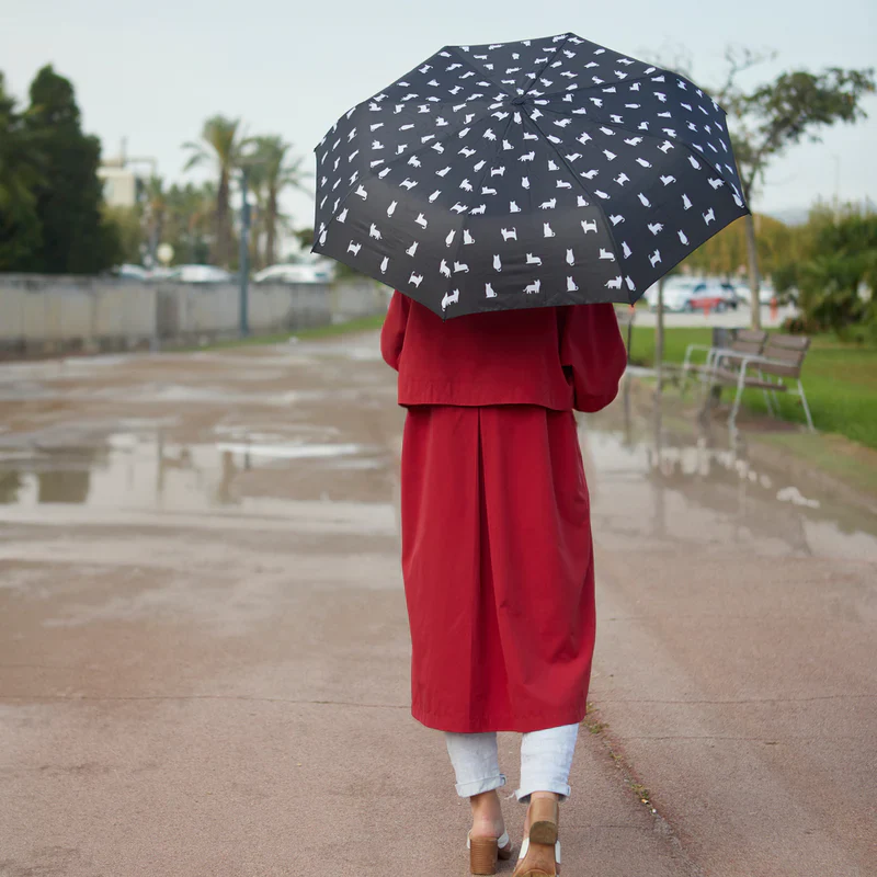 Paraguas ideal para los amantes de los gatos, para los que quieran pasearse llevando a sus mejores amigos felinos en los días lluviosos de la ciudad. Abierto, con un estampado de gatitos felices correteando, y cerrado es un divertido gato negro con orejitas. Además, cuenta con una funda de neopreno para que no mojes tus enseres más preciados (ni a tu gato!).